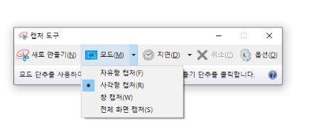 캡처할 모드(사각형, 자유형, 창, 전체화면)를 선택합니다.