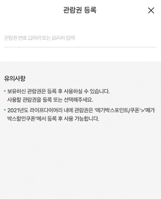 관람권 등록 시 관람권번호 12자리와 패스워드 4자리를 합쳐서 총 16자리를 입력해야 합니다. 저도 처음에 이것 때문에 고생을 좀했는데요, 비밀번호까지 꼭 같이 입력하셔야 정상적으로 예매가 됩니다.
