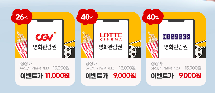 메가박스, 롯데시네마는 40%할인으로 9,000원에 이용가능하고, CGV는 26% 할인을 적용한 11,000원으로 이용가능합니다. 그 외에 롯데시네마 샤롯데 5% 할인, CGV 씨네드셰프 9% 할인이 있습니다. 할인율과 해당되는 영화관은 조금씩 변동이 있으니 꼭 홈페이지에서 확인하시기 바랍니다.