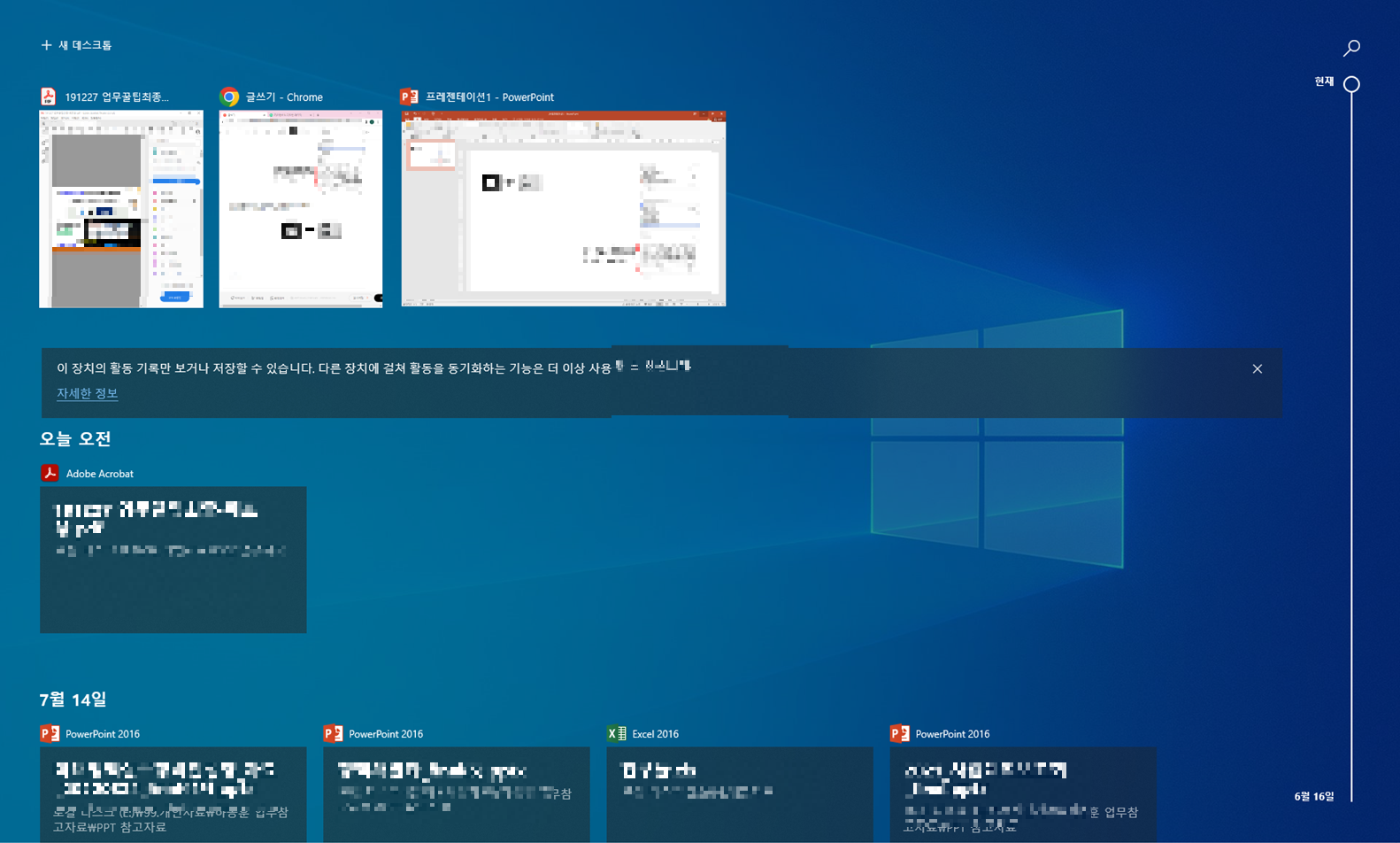 문득 누가 제 컴퓨터를 열고 작업기록을 확인한다면 굉장히 기분이 나빠질것 같습니다. 이번에는 반대로 작업보기(타임라인) 목록을 지우는 방법을 설명드리겠습니다.