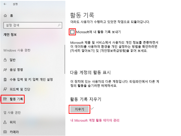 그 후 활동기록 '지우기' 버튼을 클릭하여 지워줍니다.