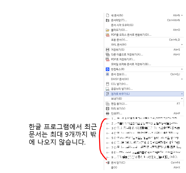 한글 프로그램의 최근 문서는 최대 9개 목록 밖에 나오지 않습니다.